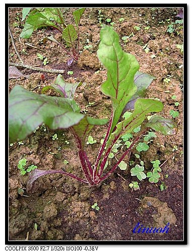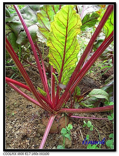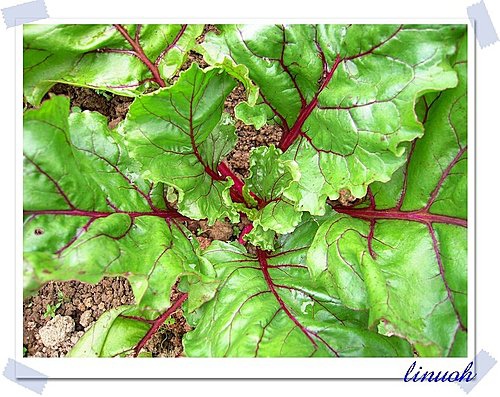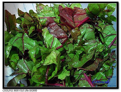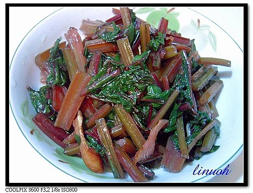 甜菜根的葉子先川燙,油鍋將薑、蒜頭爆香,加入川燙後的甜菜根葉子,少許鹽調味。