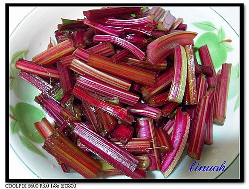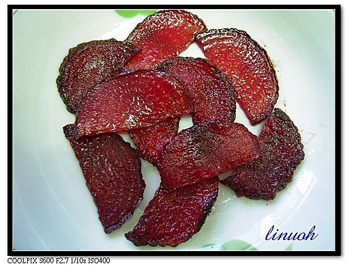 ↑煎甜菜根:少許油煎過的甜菜根片滋味一級棒,很好吃。
