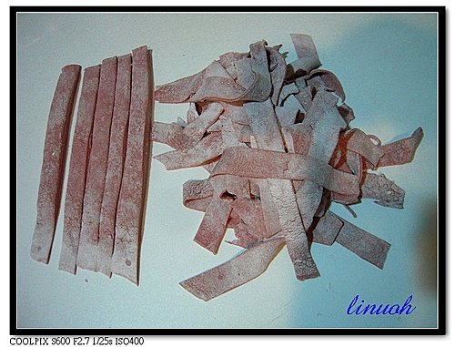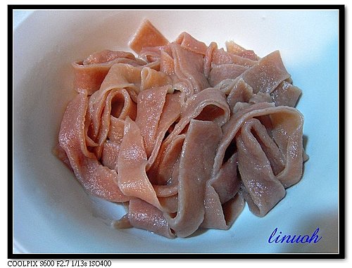 將甜菜根打汁,加入麵粉和勻,揉成麵糰,撖成麵皮,切成麵條,麵條寬度